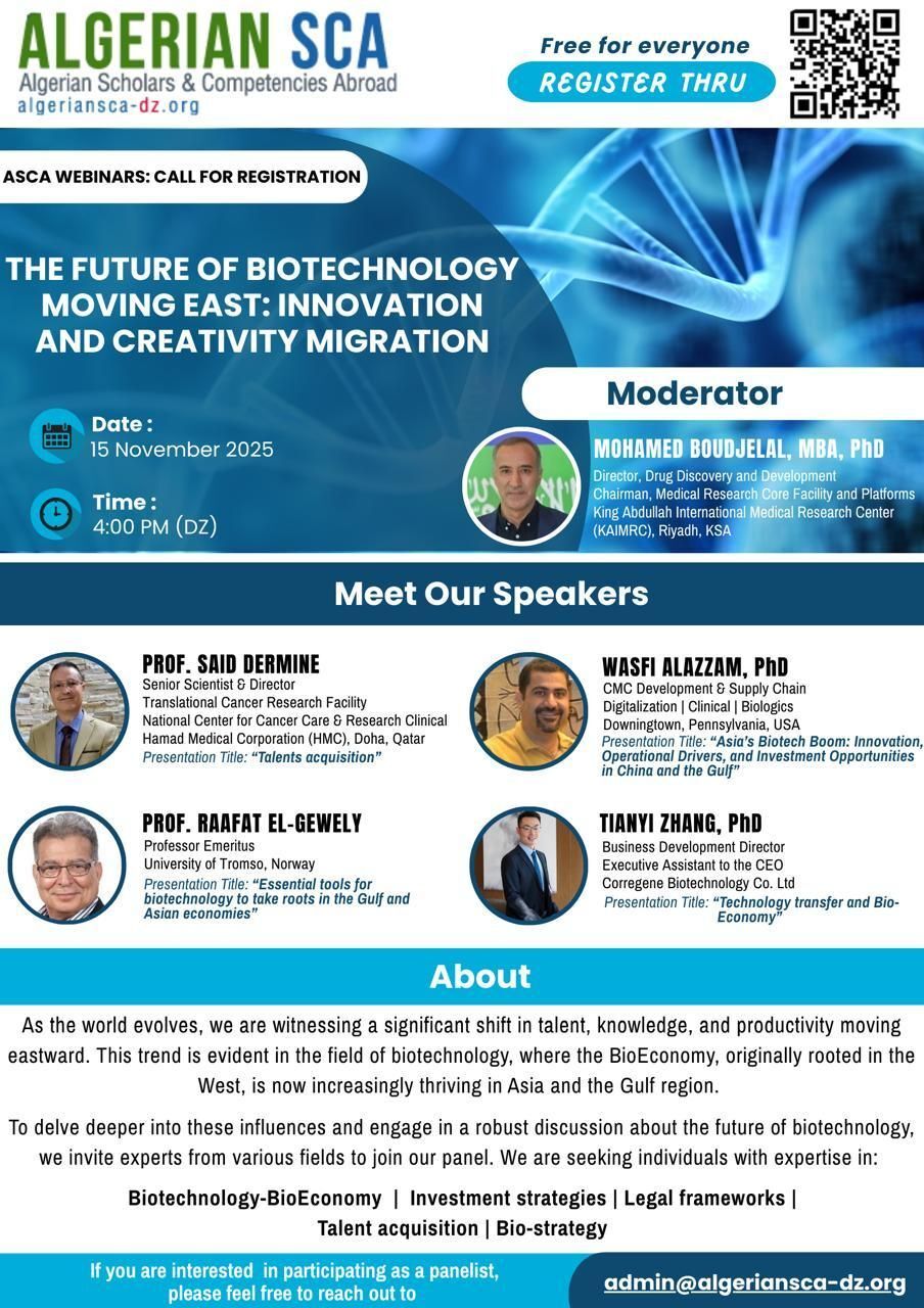 The members of the Algerian Scholars and Competences Abroad (ASCA) Platform are pleased to announce the launch of a series of webinars in all fields of Science and Technology. These webinars will take place on Saturdays from 7:00 p.m. to 8:00 p.m., Algerian time, from November 15, 2023, to January 31, 2024, and are intended for doctoral students, young researchers, and professionals in the socio-economic sector.